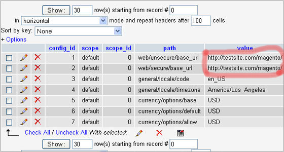 d). Locate the rows “web/unsecure/base_url” and “web/secure/base_url” and click Edit (the pencil icon) in the corresponding lines.
