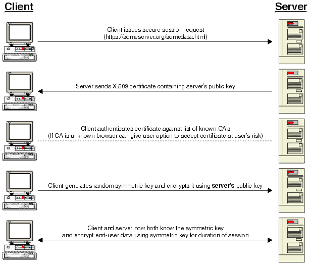 Suppose Alice (A, the browser) wishes to communicate with Bob (B, the server) then the exact steps that takes place inorder to begin the encrypted communication are: