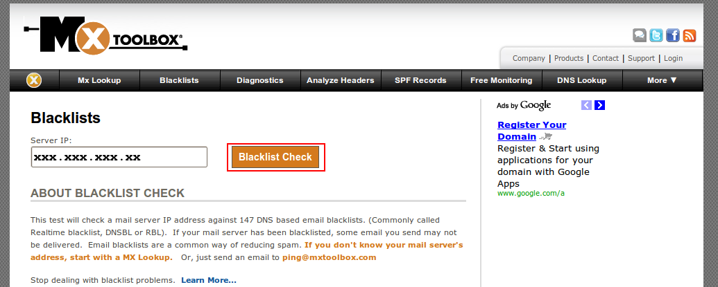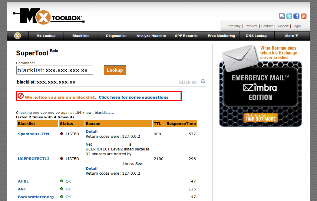When the IP is entered and you click ‘Blacklist Check’, the resultant screen should be expected as (Assuming your server IP is on a blacklist)