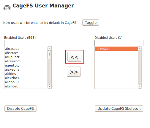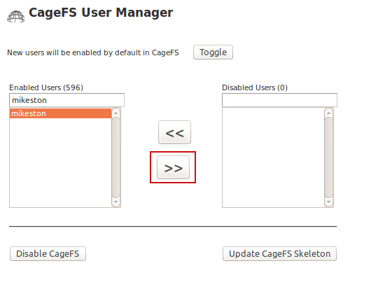 Go to WHM » Plugins » CageFS and select the user you need to remove and click the ‘>>‘ button.