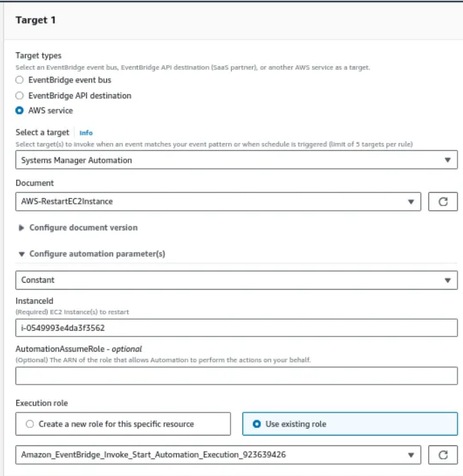 When you choose the target, select the target as Systems Manager Automation and Document as AWS-RestartEC2Instance, then provide the instance ID in the InstanceId field. Please have a check on the below screenshot.