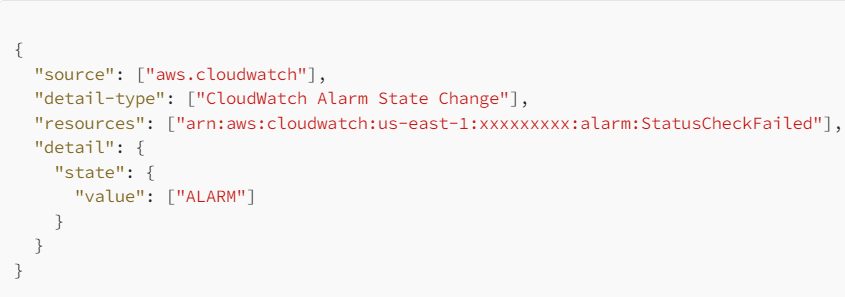 Once the Alarm creation complete, we can create an event rule to run the SSM runbook on the state of ALARM. For that you can use the below event pattern.