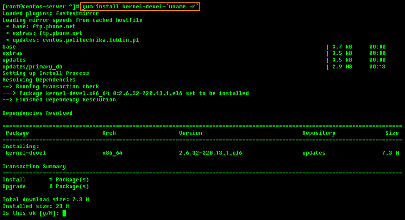 This command makes sure that the kernel devel version matches your current version. Proceed with the installation. Once the kernel-devel is completed you will get the directory for the current kernel in /usr/src/kernels