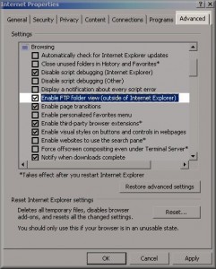 2 : Select the Advanced tab at the top and scroll down to you see Enable FTP folder view (outside of Internet Explorer) and make sure it is Checked.