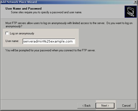 10. Enter your username replacing the @ with %25, i.e. serveradmin%25example.com. Click Next to continue.