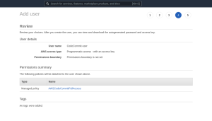 - Create an IAM user with CodeCommit access and generate HTTPS Git credentials, since git https credentials will be asked when running git clone.